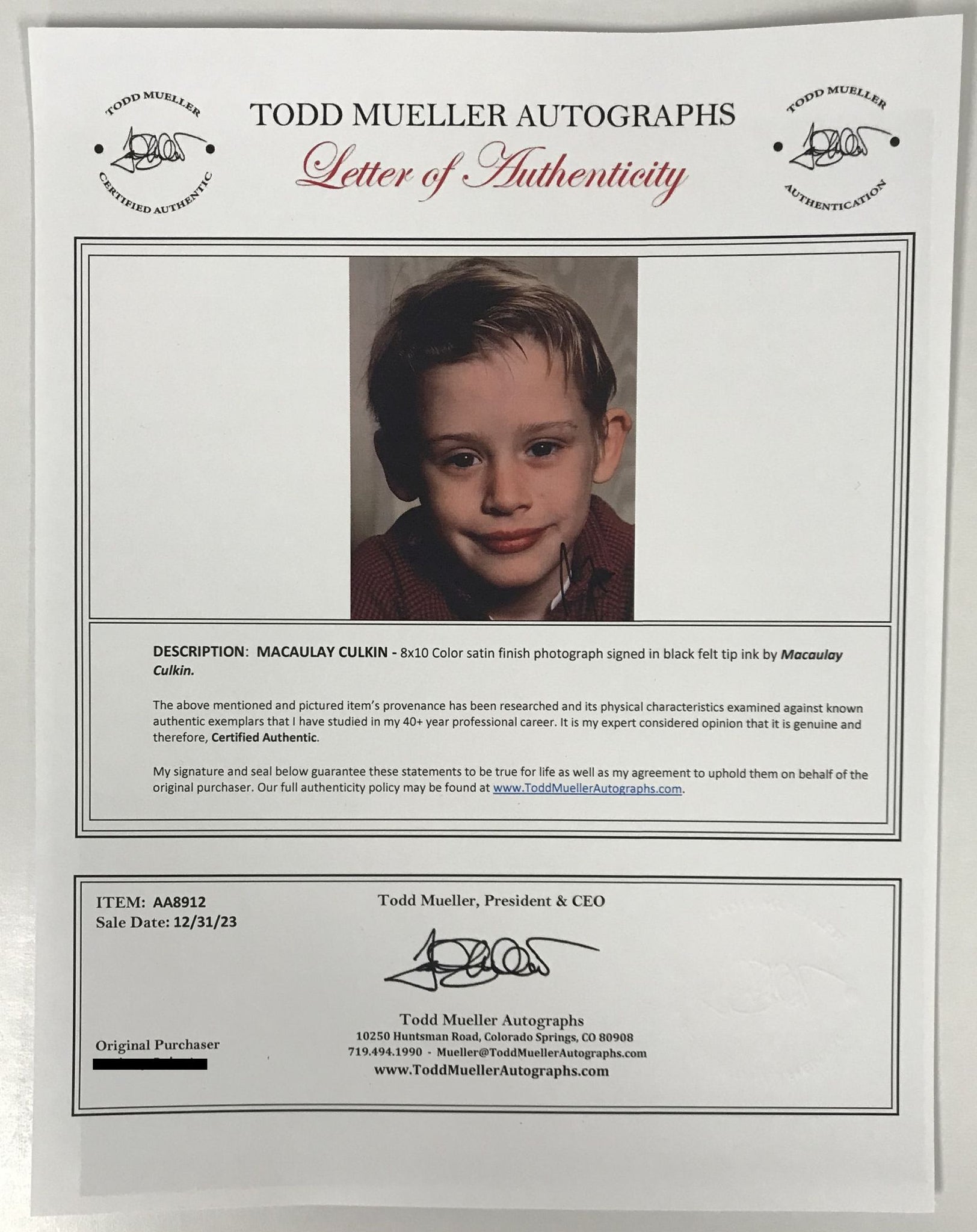 Macaulay Culkin Signed Autographed "Home Alone" Glossy 8x10 Photo - Todd Mueller COA