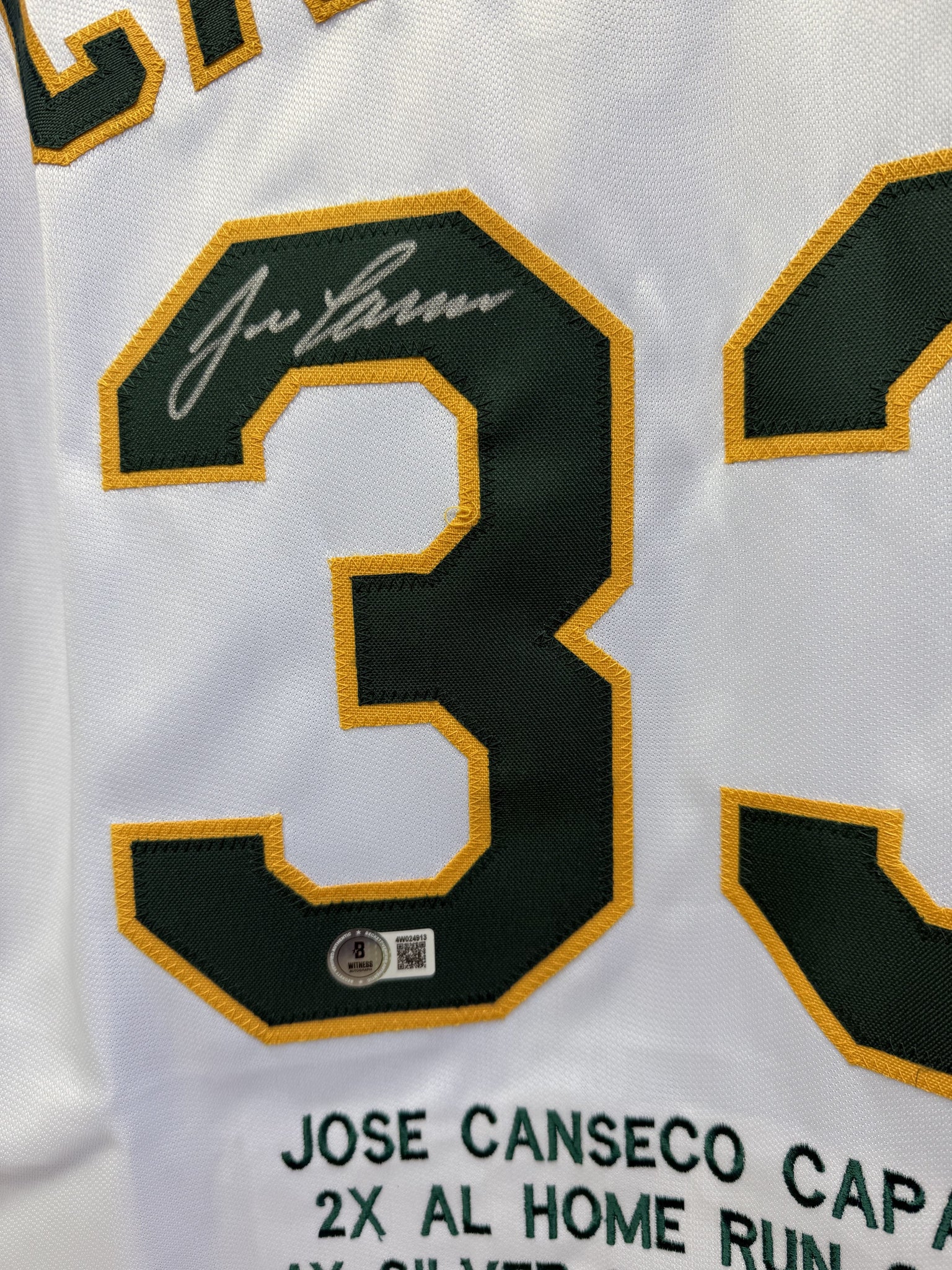 Details: A fantastic Adult Size XL baseball jersey hand-signed by MLB legend Jose Canseco. The signature has been authenticated by Beckett BAS and includes their authentication sticker attached. The jersey includes Canseco's impressive career stats. An absolutely beautiful piece!