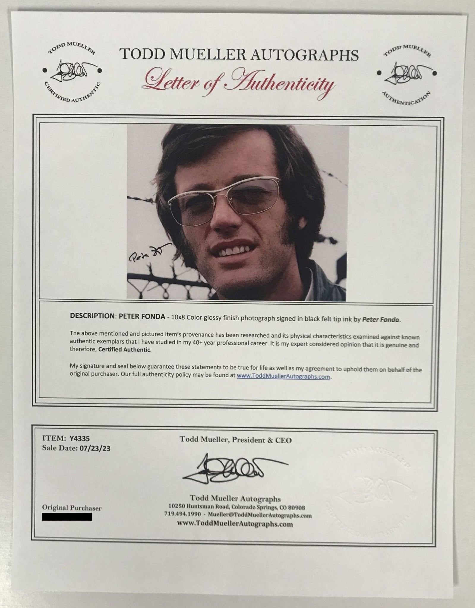 Details: A fantastic glossy 8x10 photo hand-signed by Hollywood legend Peter Fonda. It comes with a lifetime guarantee of authenticity COA from Todd Mueller Autographs. one of the most trusted names in the business. All of our items are guaranteed authentic for life and are backed by our 20+ years in the autograph business. All items are hand-signed; we never sell copies or reproductions of any kind.